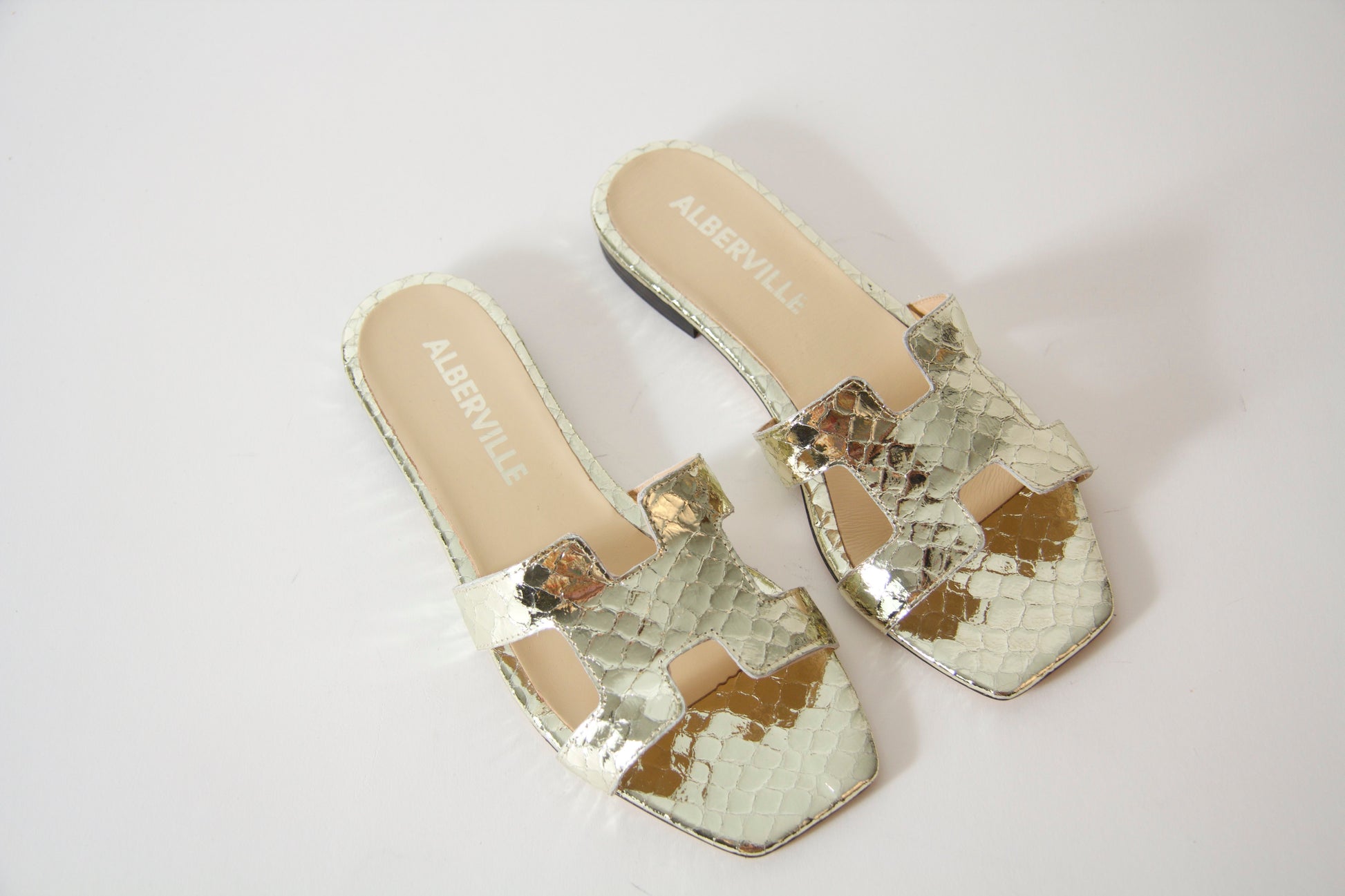 Kay are classy slip-in sandals in gold snake printed leather with square toe. The insock is padded for maximum comfort.