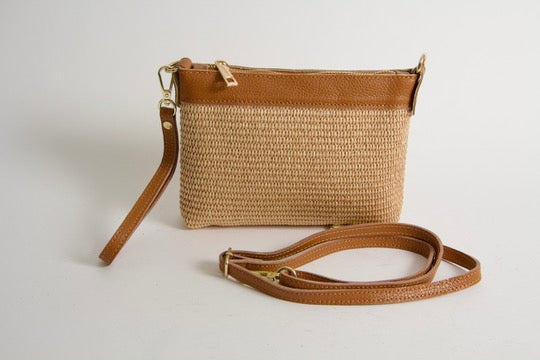 Mini Bag is a small sized handbag in natural rafia with cuoio leather trimmings and gold colored metal hardware. You can use it as a clutch or crossbody.