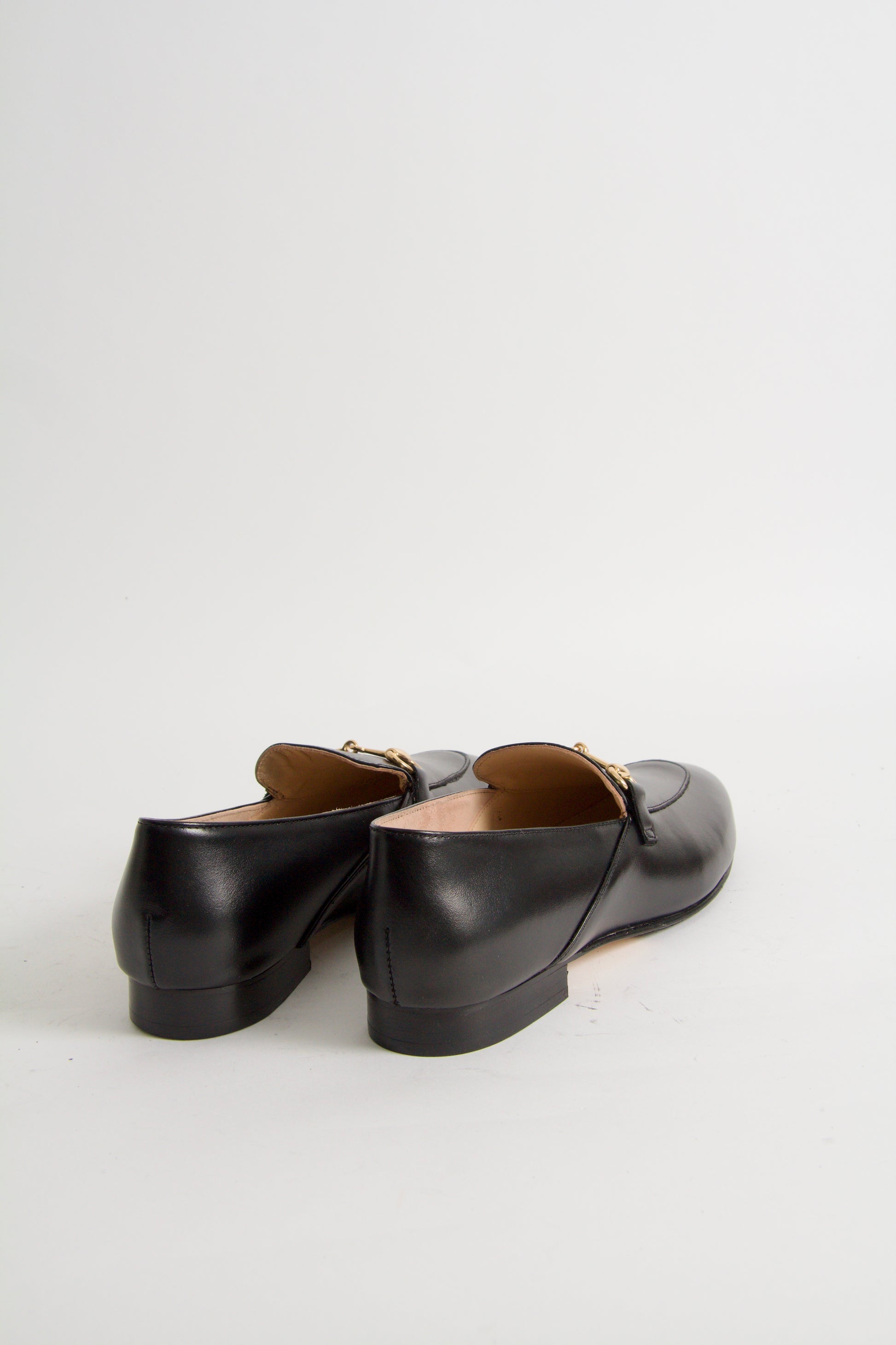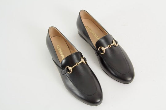 Olympia are preppy loafers from Alberville made in black leather with a golden detail on the upper. The classic style is set on a low heel.