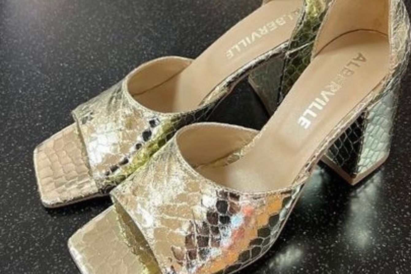 Rihanna are heeled open toe sandals with a chunky silhouette made in gold snake printed leather. The style has an adjustable ankle strap, a square toe shape and a mid block heel.