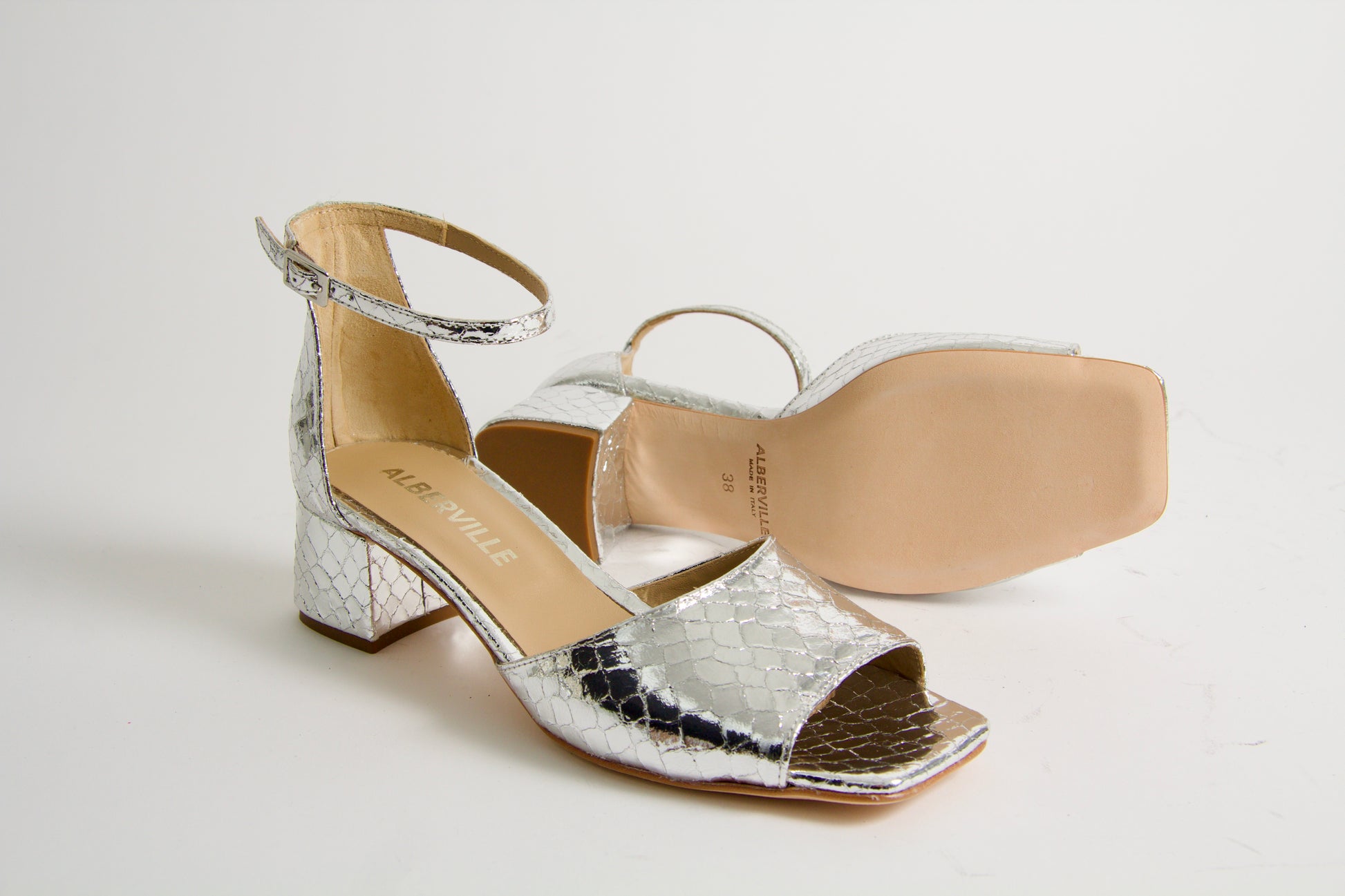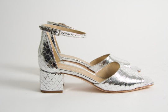 Our heeled sandal Rosa is an open toe sandals with an elegant silhouette made in silver snake printed leather. The style has an adjustable ankle strap, a square toe shape and a mid block heel.