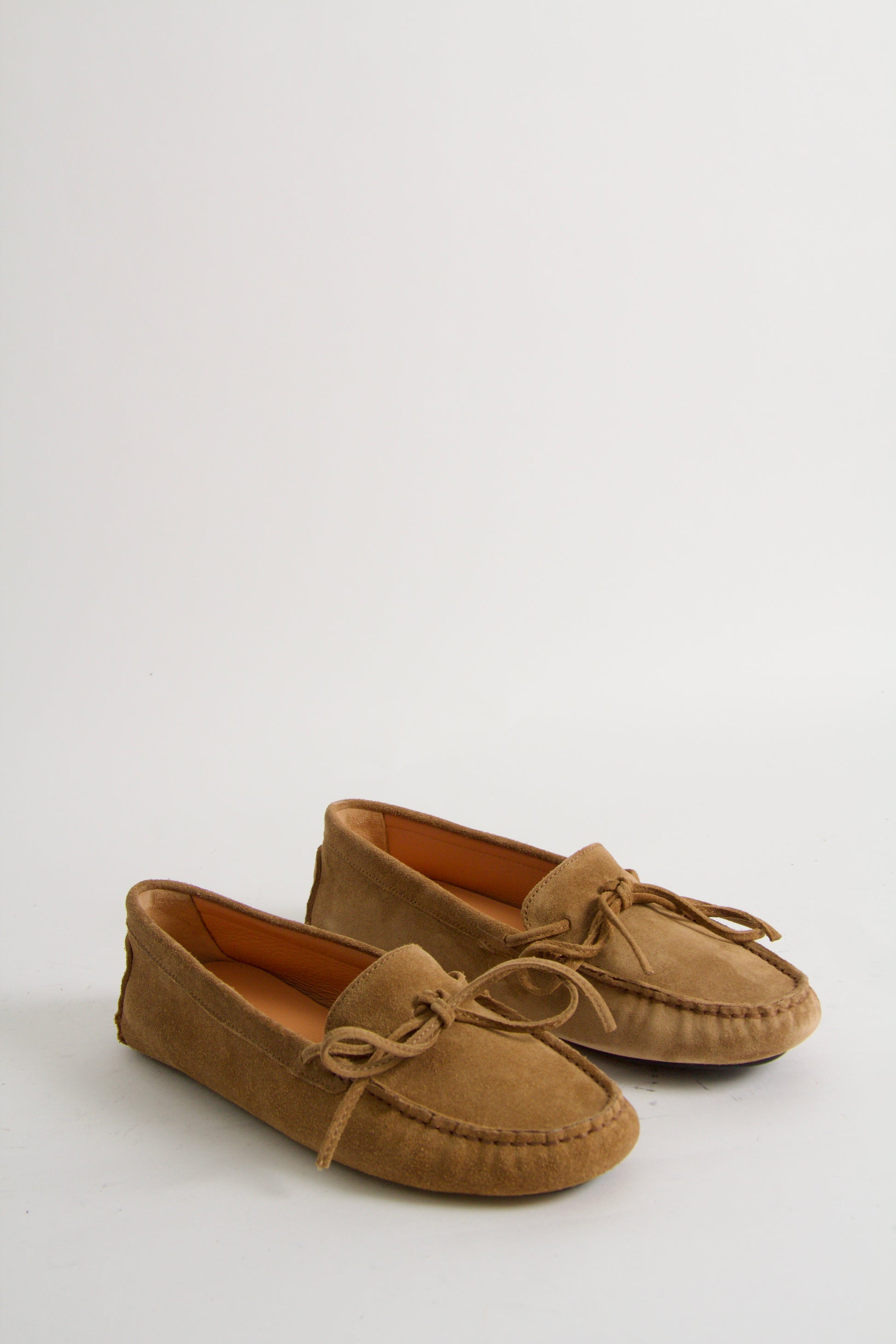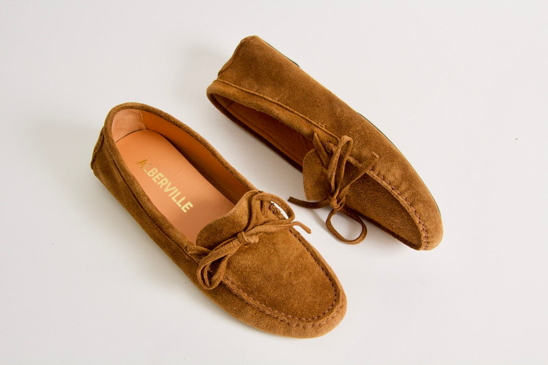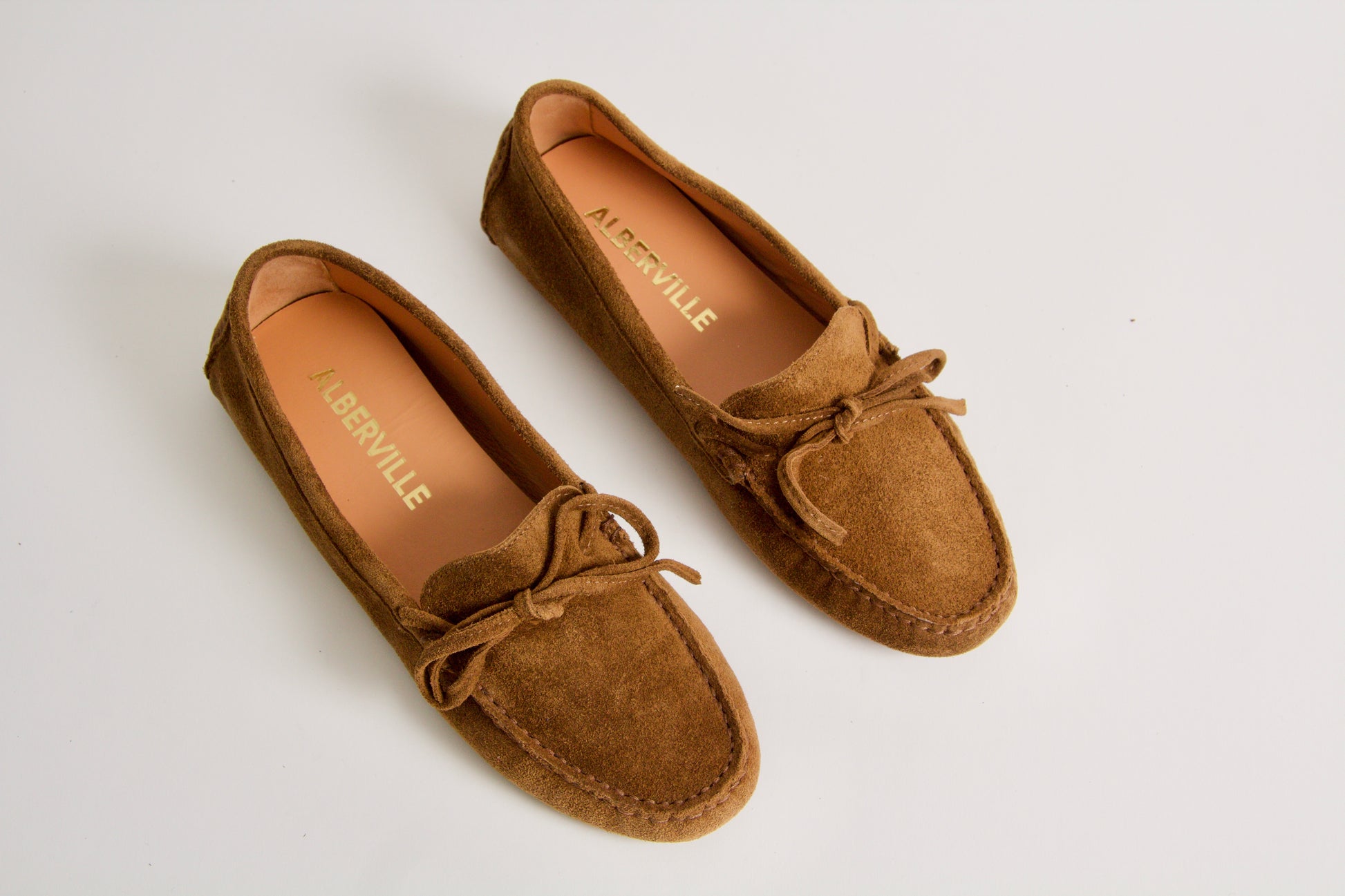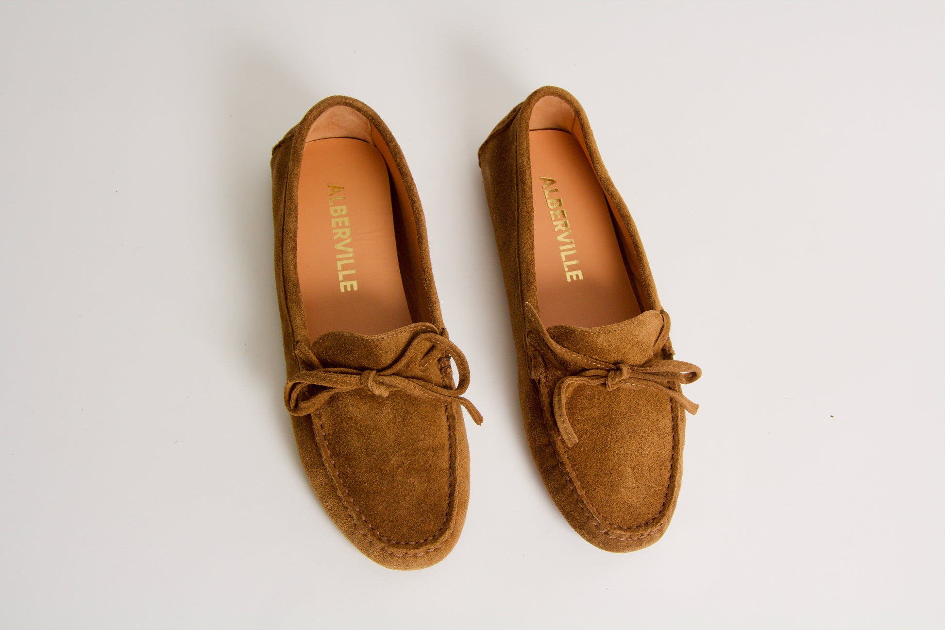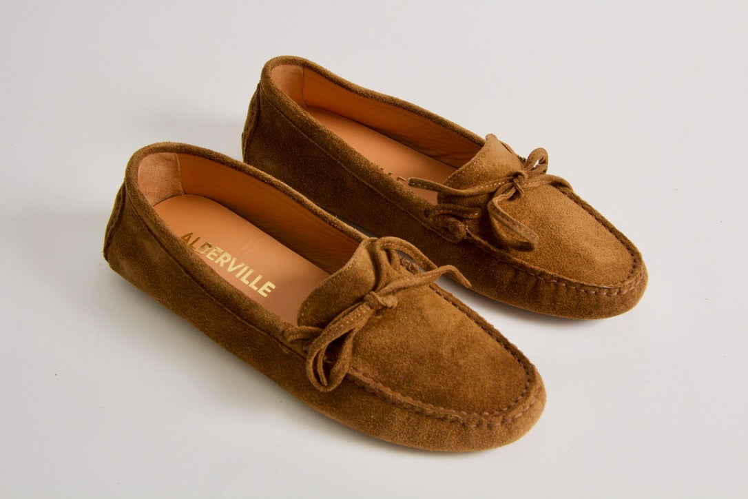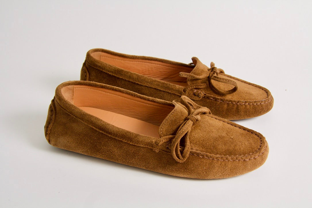 Rosalie is a classic driver moccasin made in cognac colored suede with a bow detail on the upper and decorative stitching. The style has a soft rubber sole for optimal comfort.