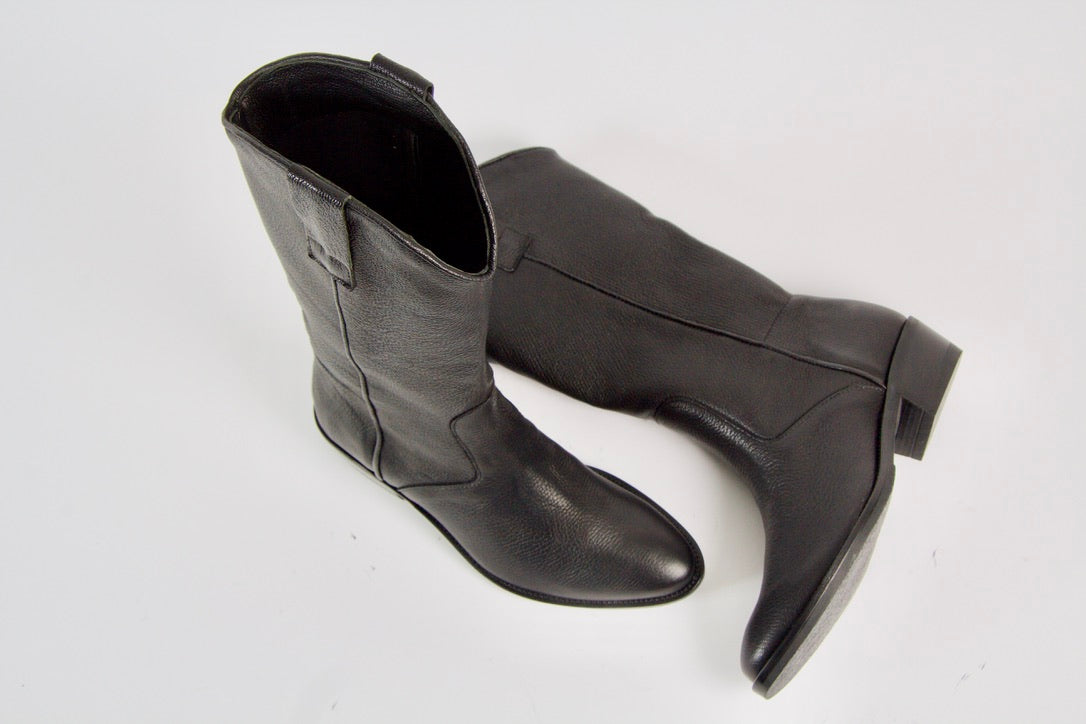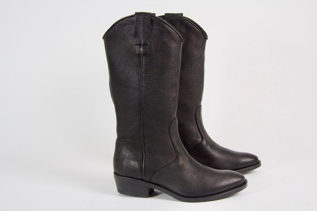 Simona is a modern western boot made in black leather with a high shaft. The timeless style is defined by its distinctive pointy toe shape and mid block heel.