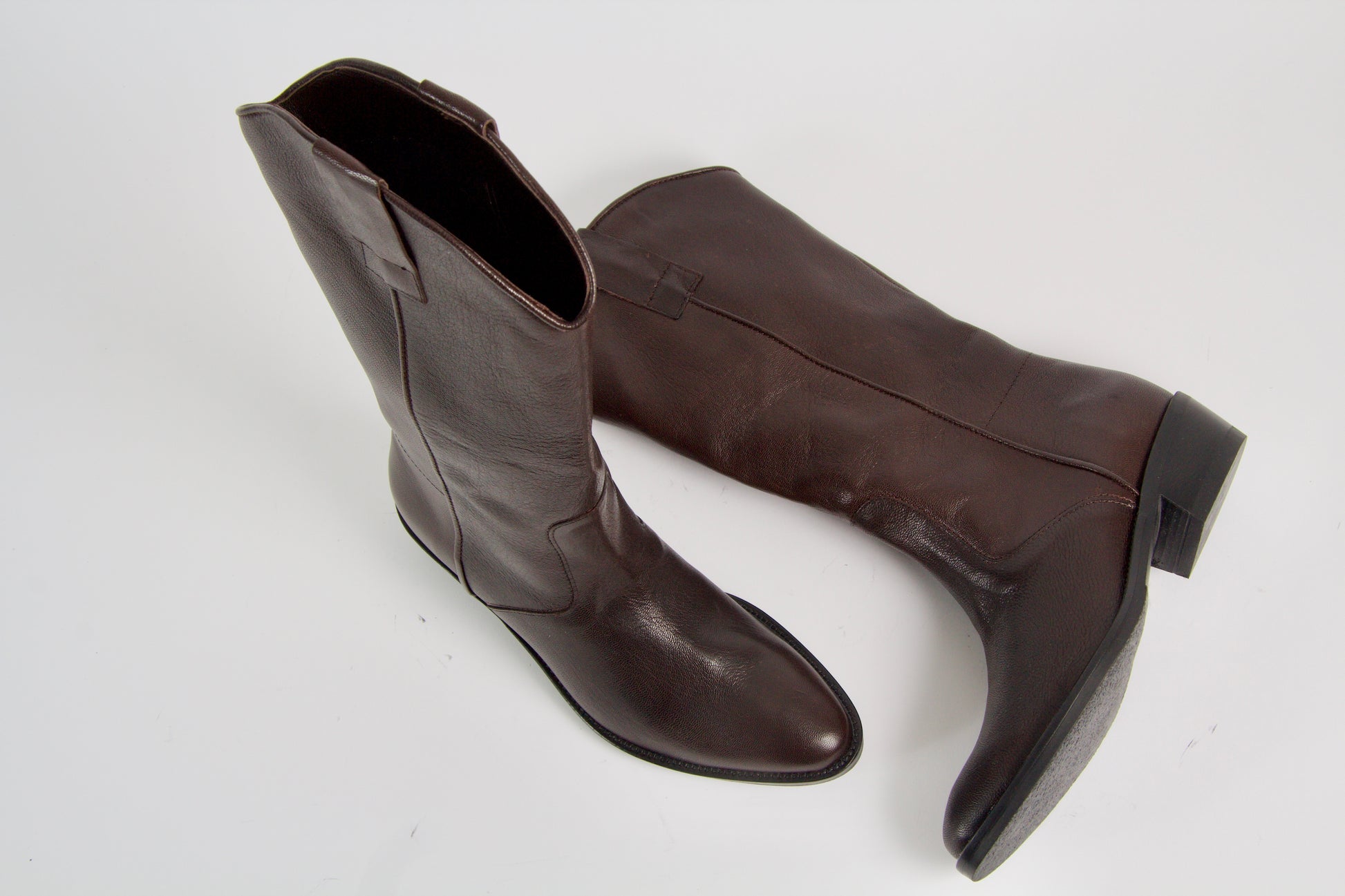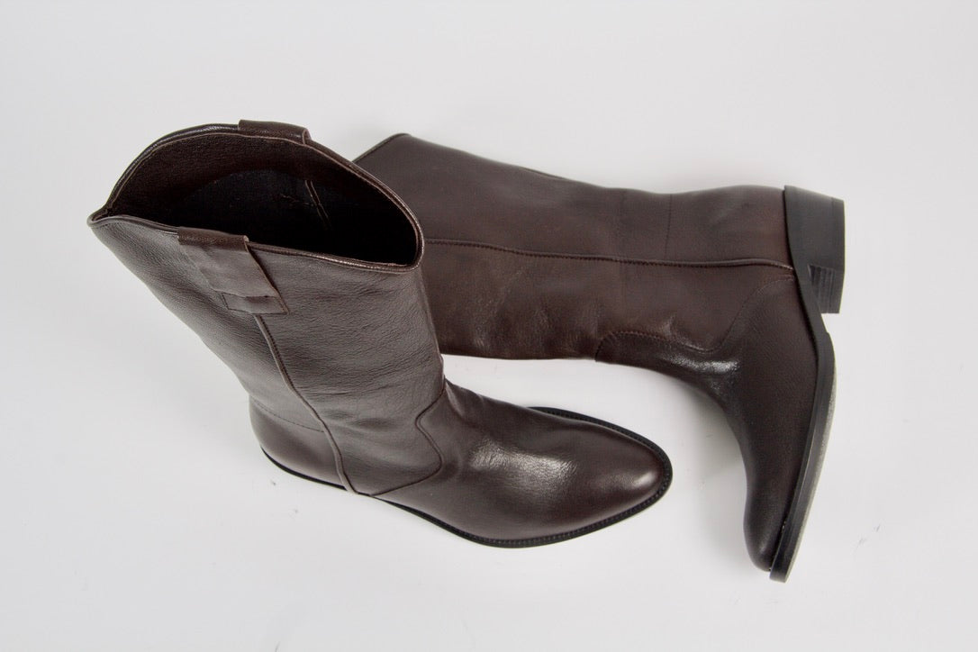 Simona is a modern version of the classic western boot made in dark brown leather. The timeless style is defined by its distinctive pointy toe shape and mid block heel. The high shaft has a pull-on design.