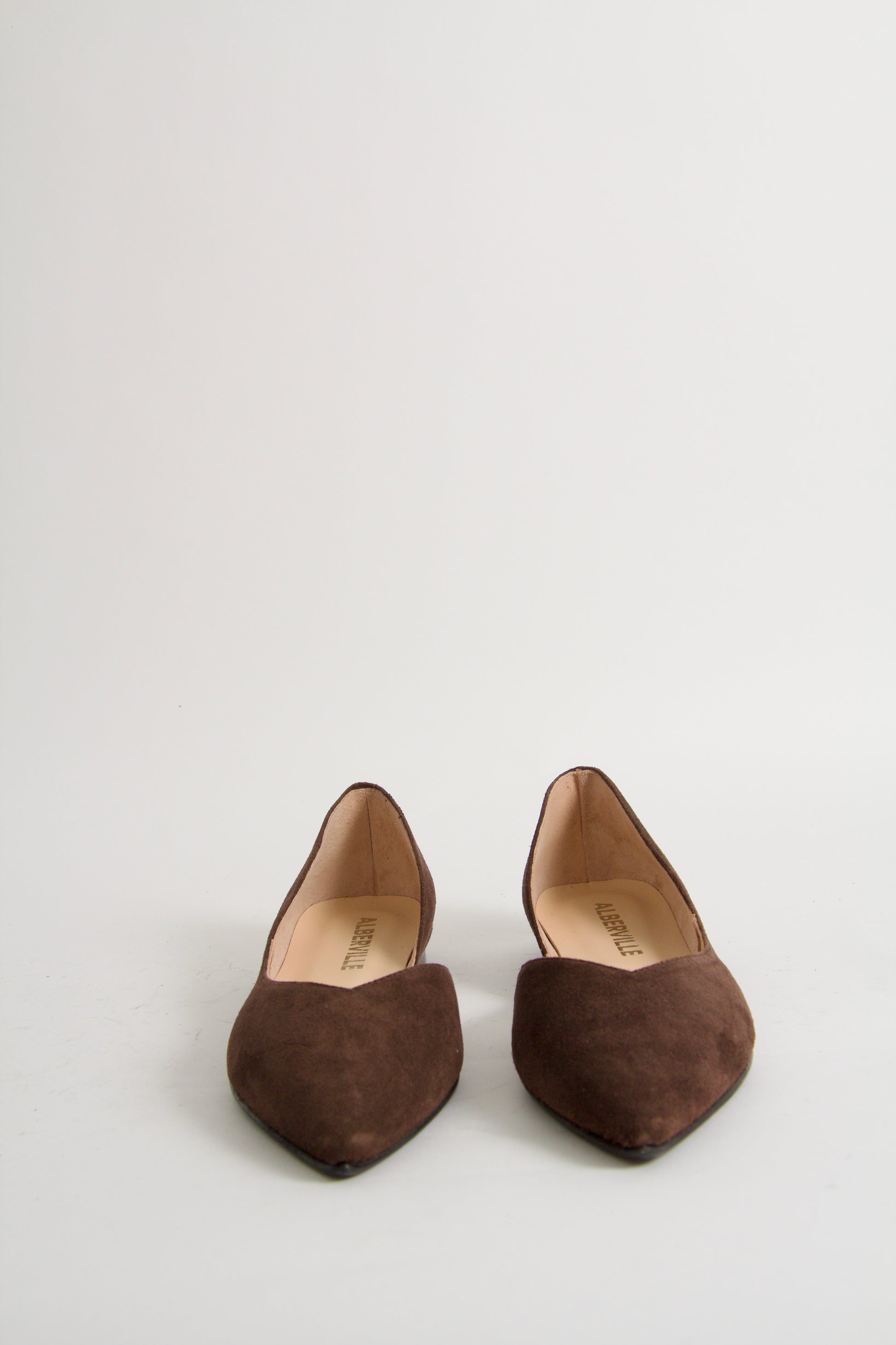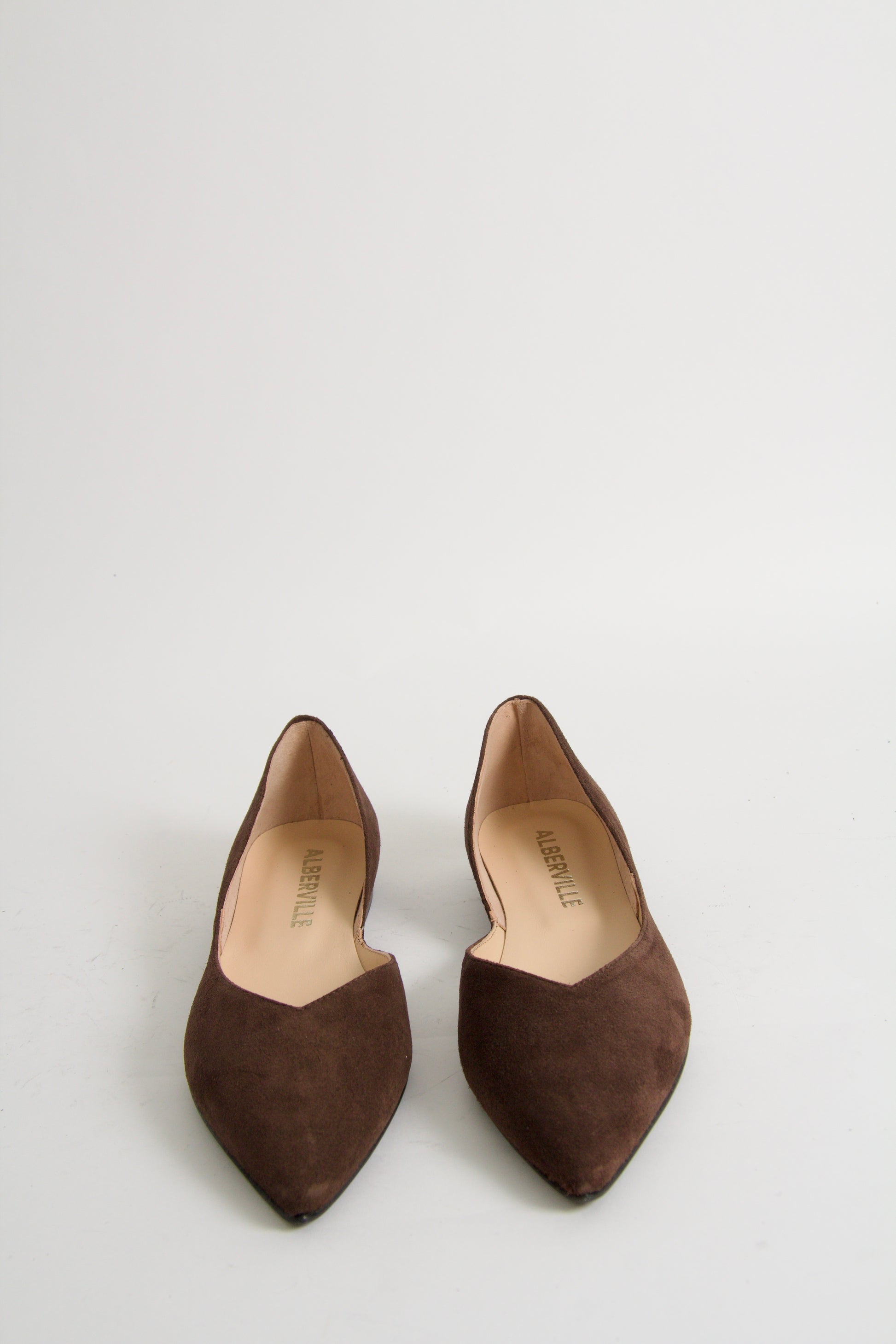 Our pointy toe ballerina flat Tabitha is a pointy style with an asymmetric cut. Made in chocolate brown suede, it has a low heel and thin rubber soles.