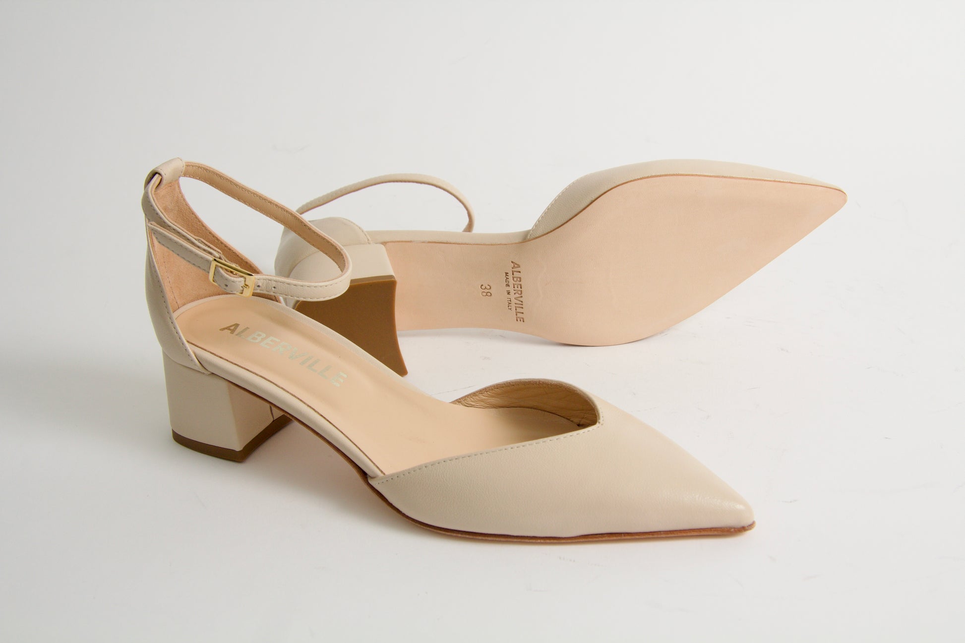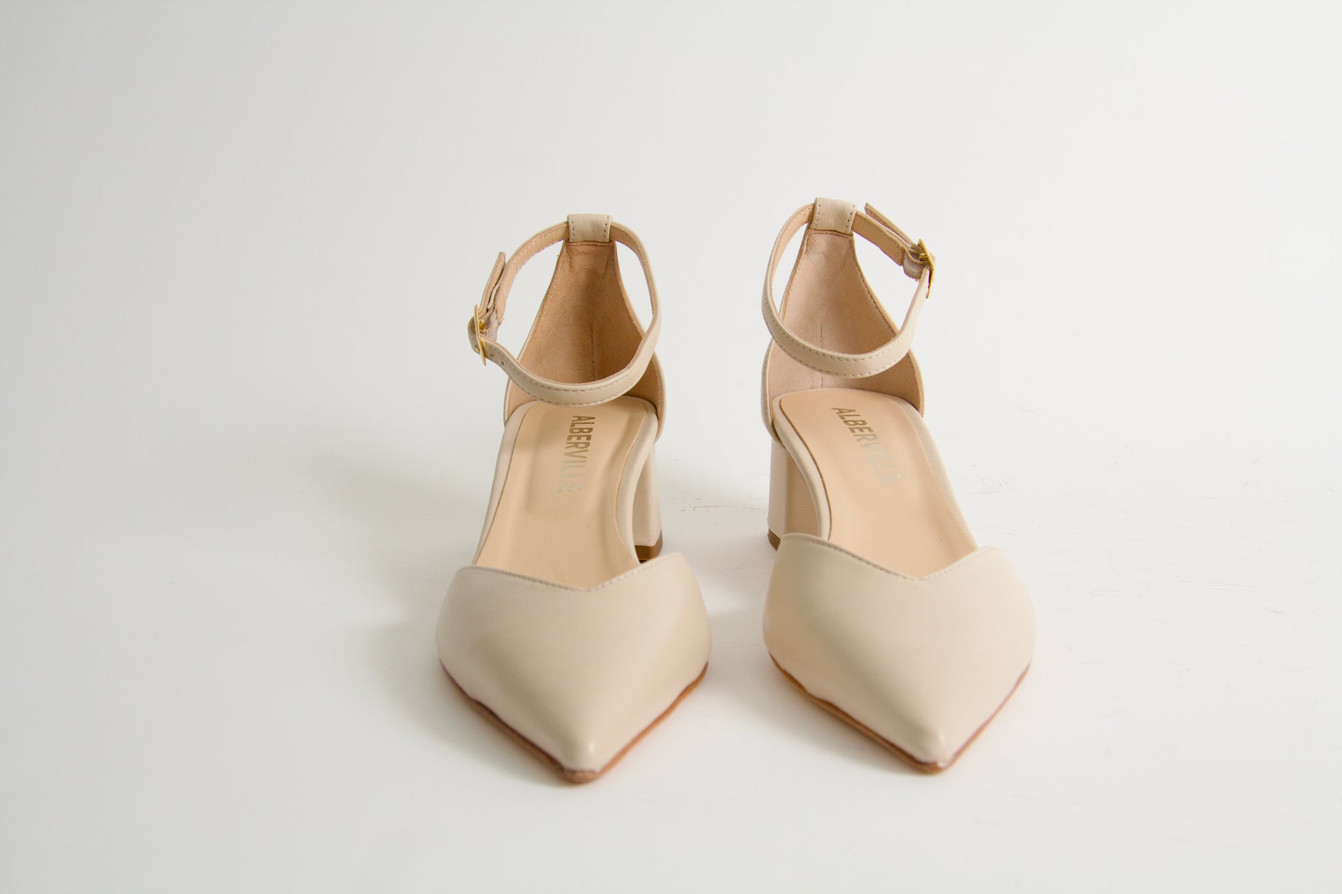 Tatum is a pointy two-piece shoe made in light beige nappa leather. The style has an adjustable ankle strap with a golden buckle and mid-high heels.