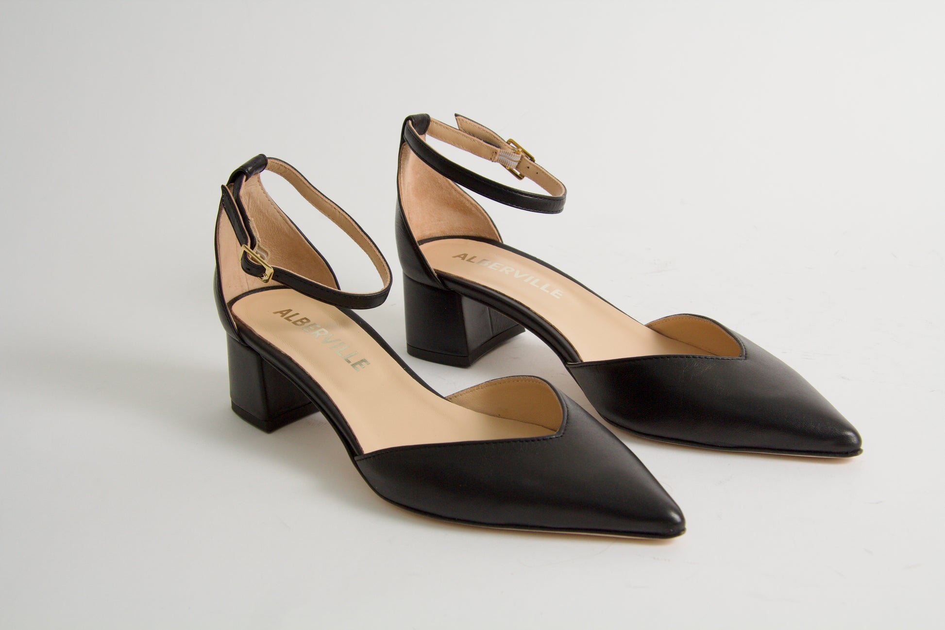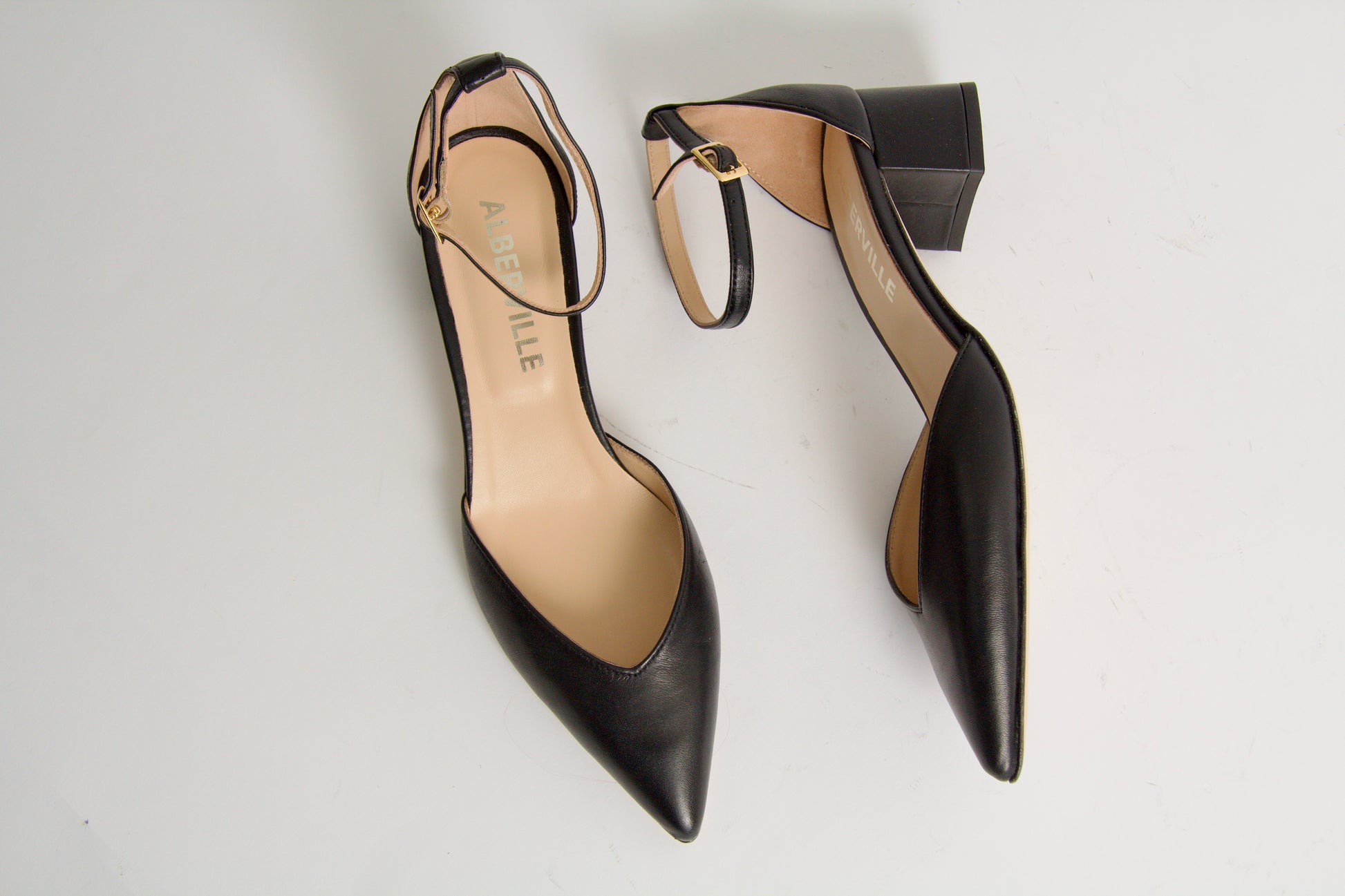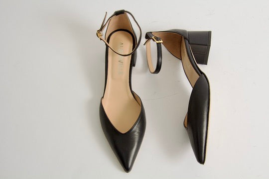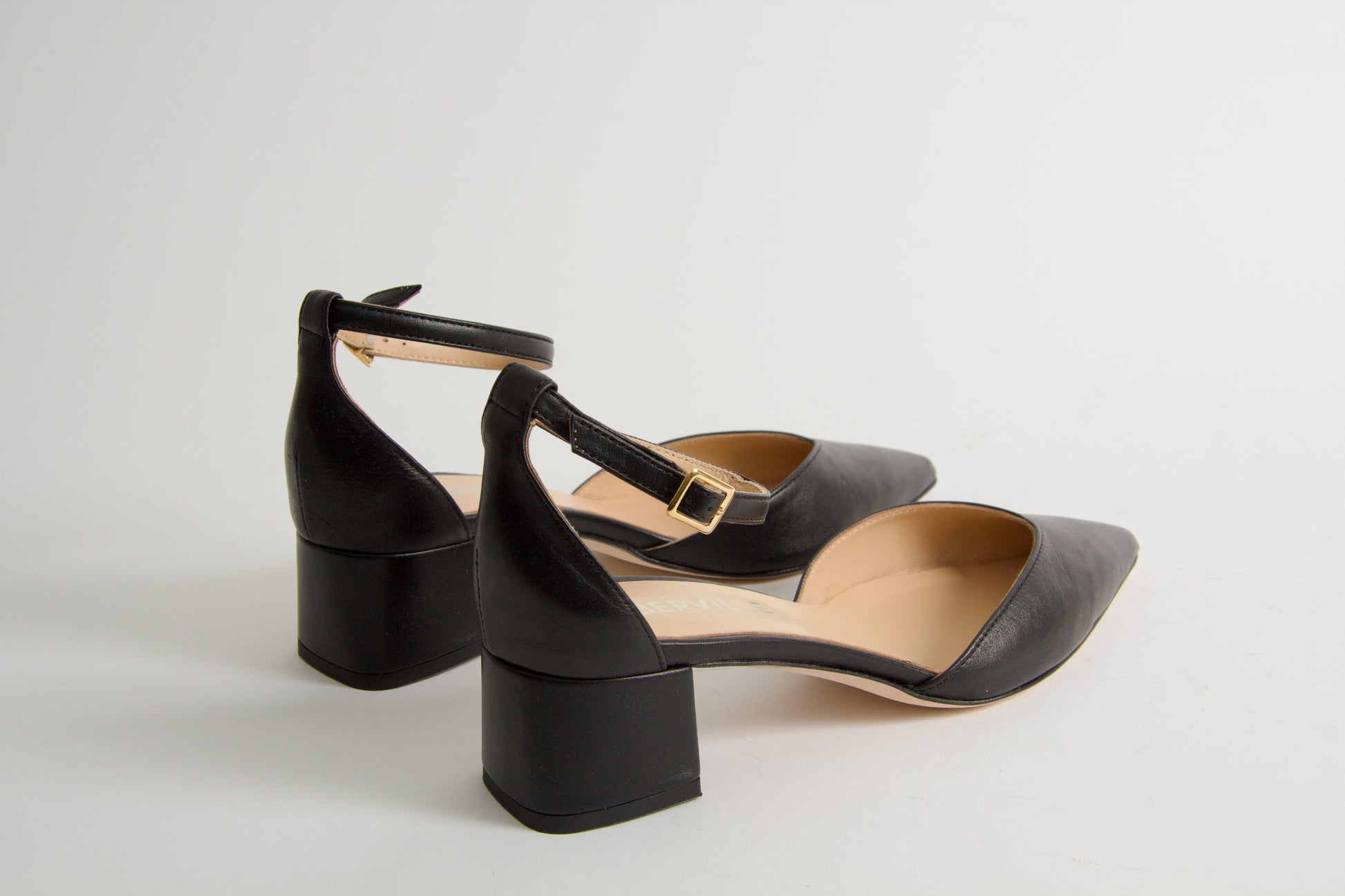Tatum is a pointy two-piece shoe made in black nappa leather. The style has an adjustable ankle strap with a golden buckle and mid-high heels.