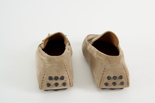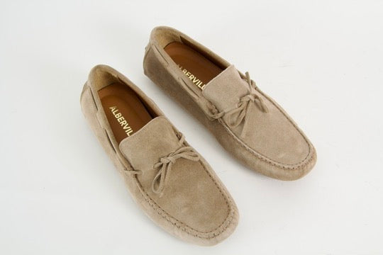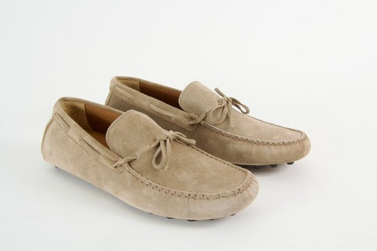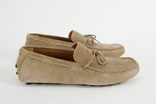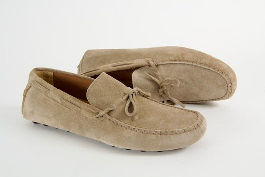 Classic driver moccasin Victor is made in taupe colored suede with a decorative ribbon. The style has a soft rubber sole for optimal comfort.