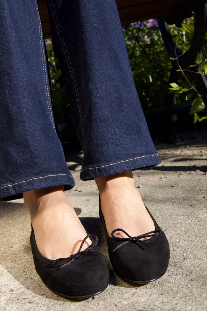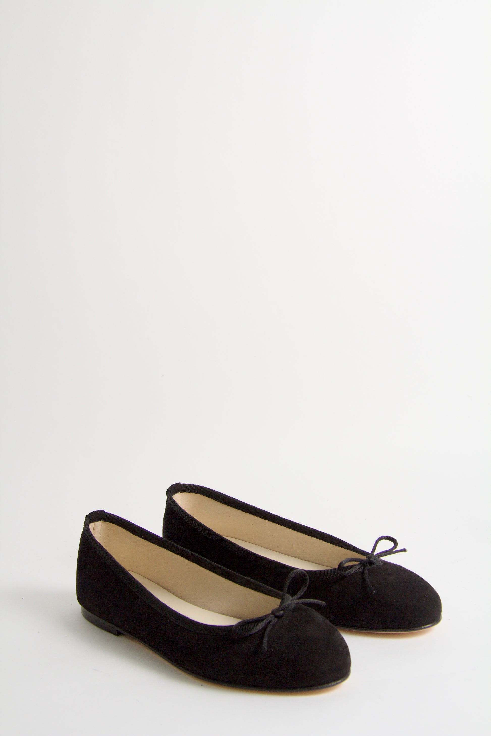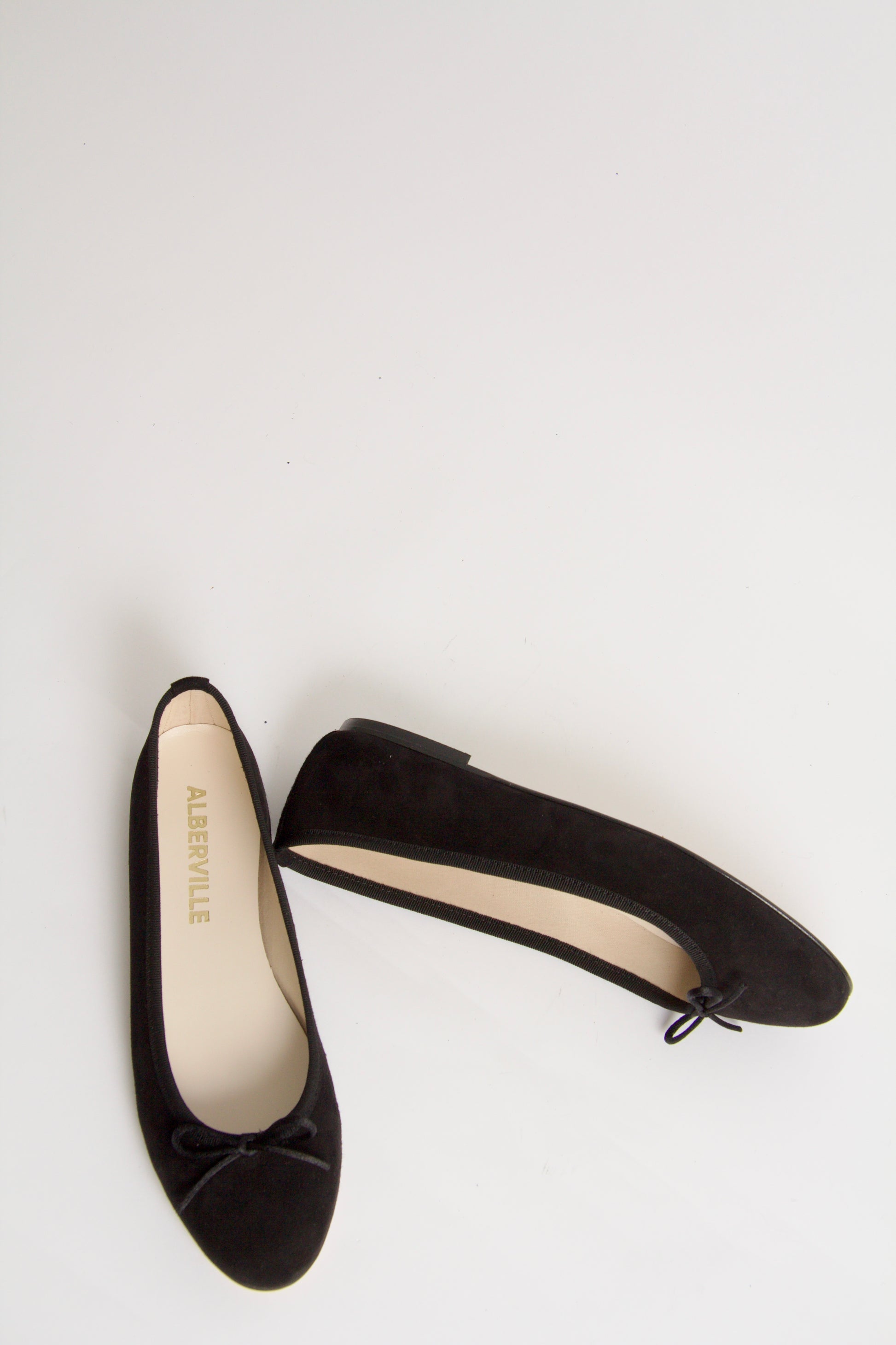 Classic ballerina Vanessa from Alberville is made in black suede with a round toe shape and a decorative bow on the upper. The timeless style has a low heel.