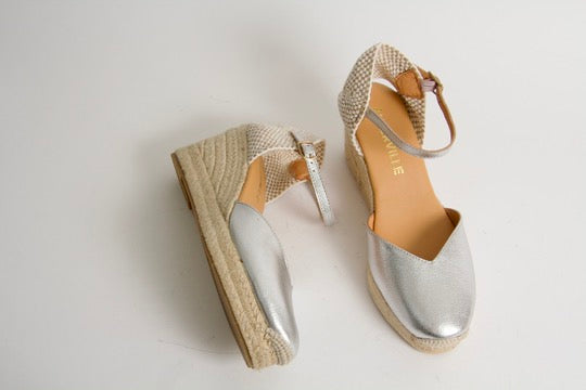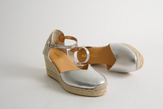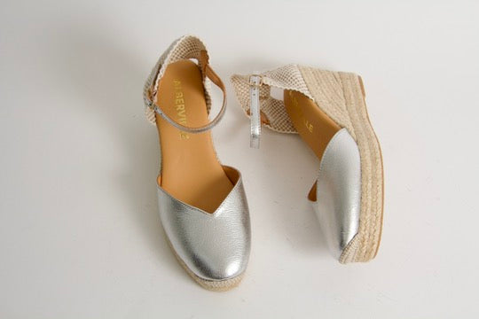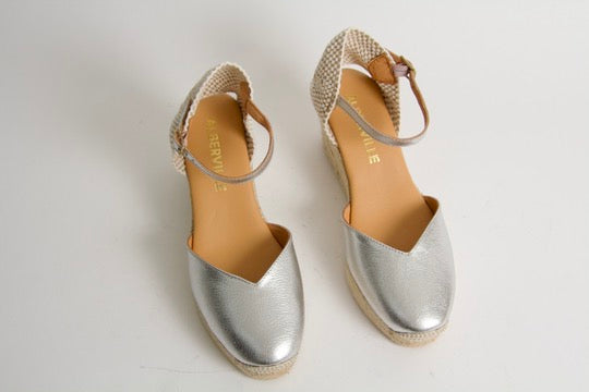 Victoria is an espadrille on a wedge heel made in silver colored nappa with an adjustable ankle strap and a small buckle. The style has a soft padded insock in leather for optimal comfort.