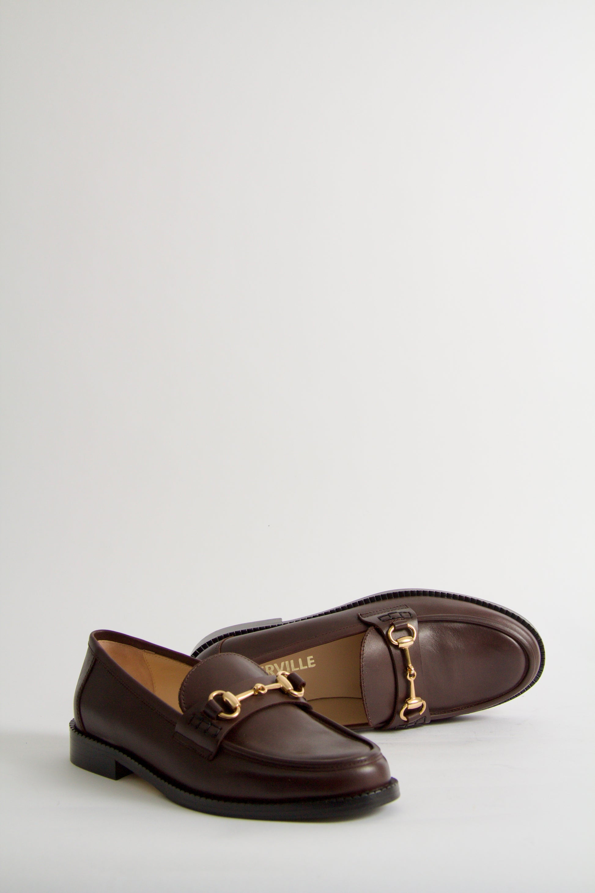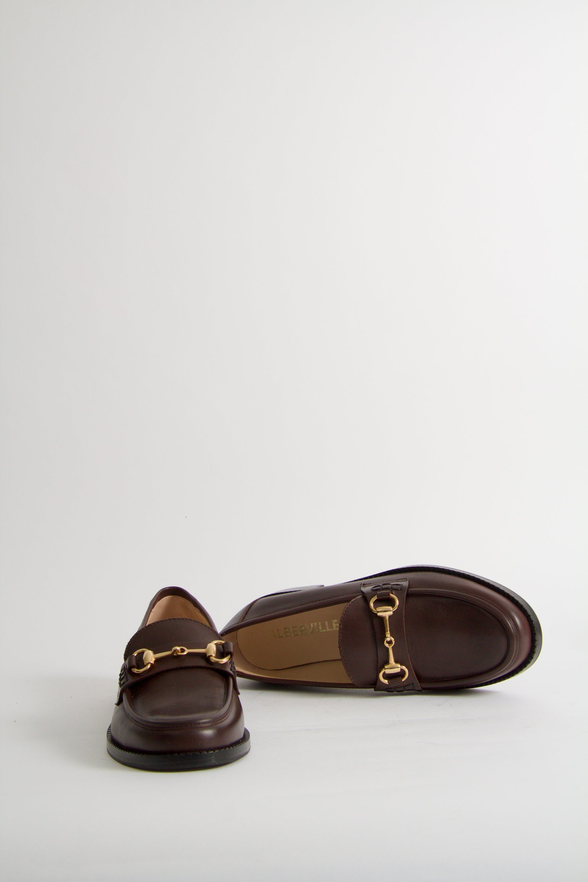Wally from Alberville is a timeless loafer crafted in dark brown leather, featuring a refined golden detail on the upper. Set on a low heel, the design includes a leather sole with a half rubber insert for enhanced grip and comfort.