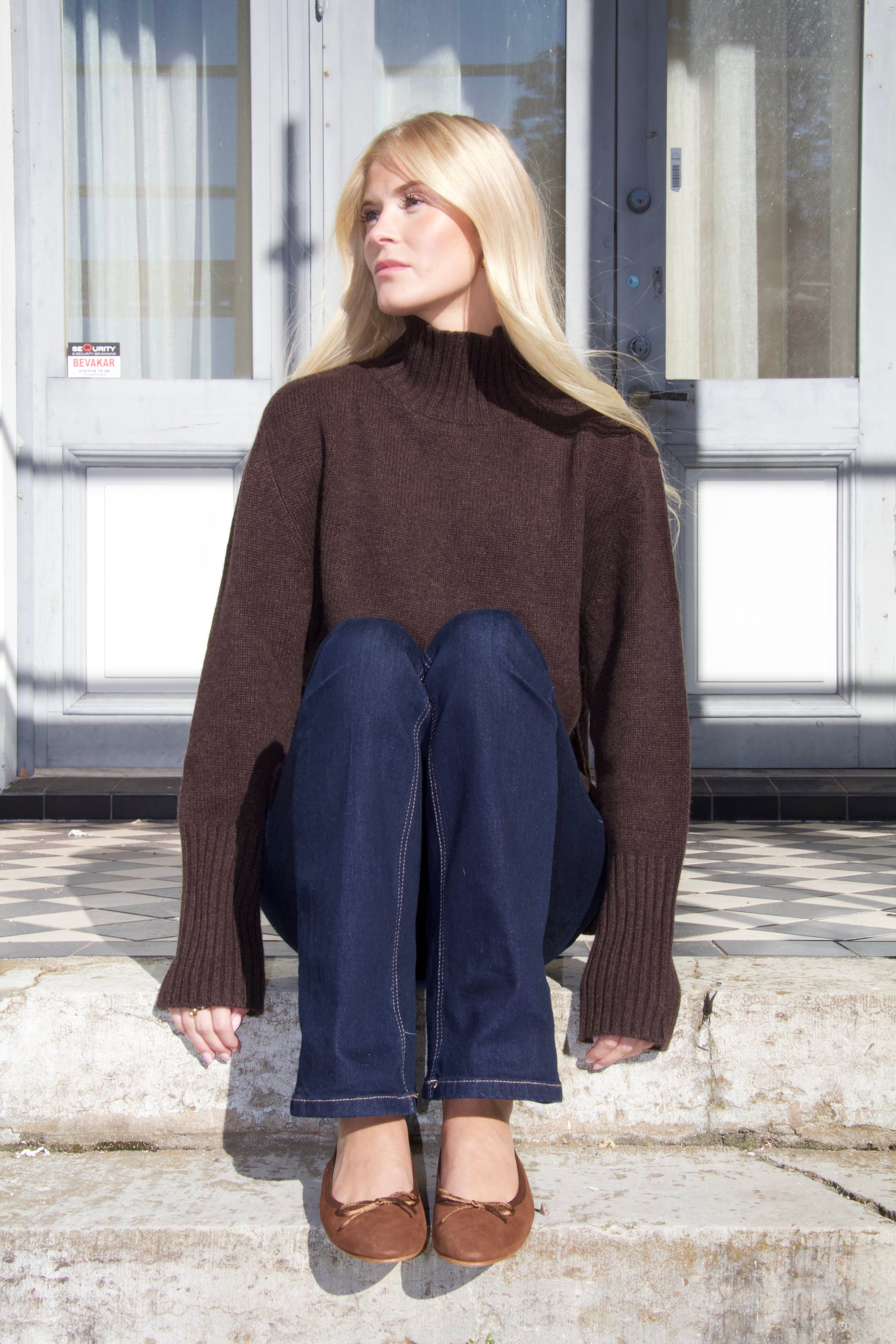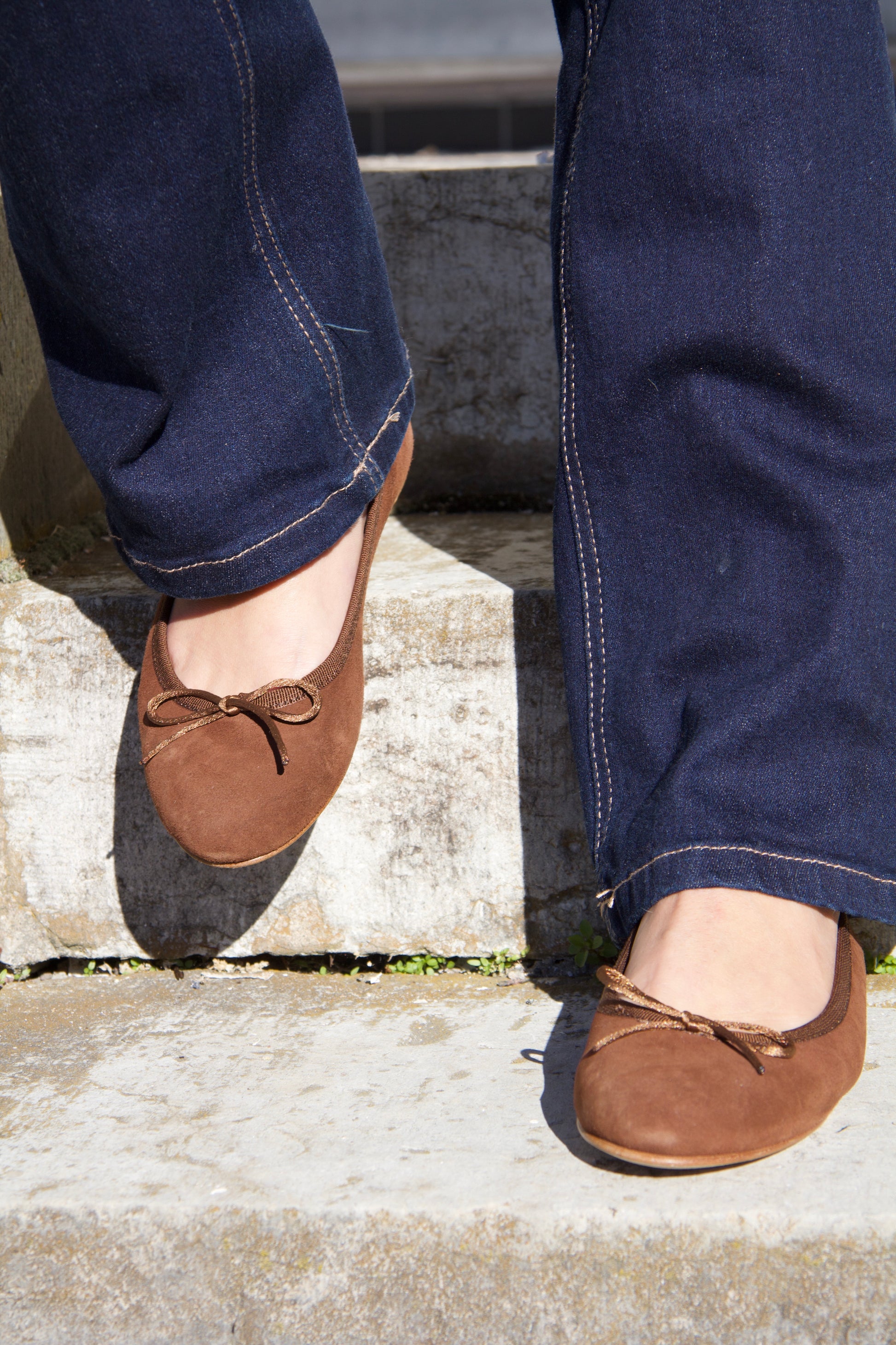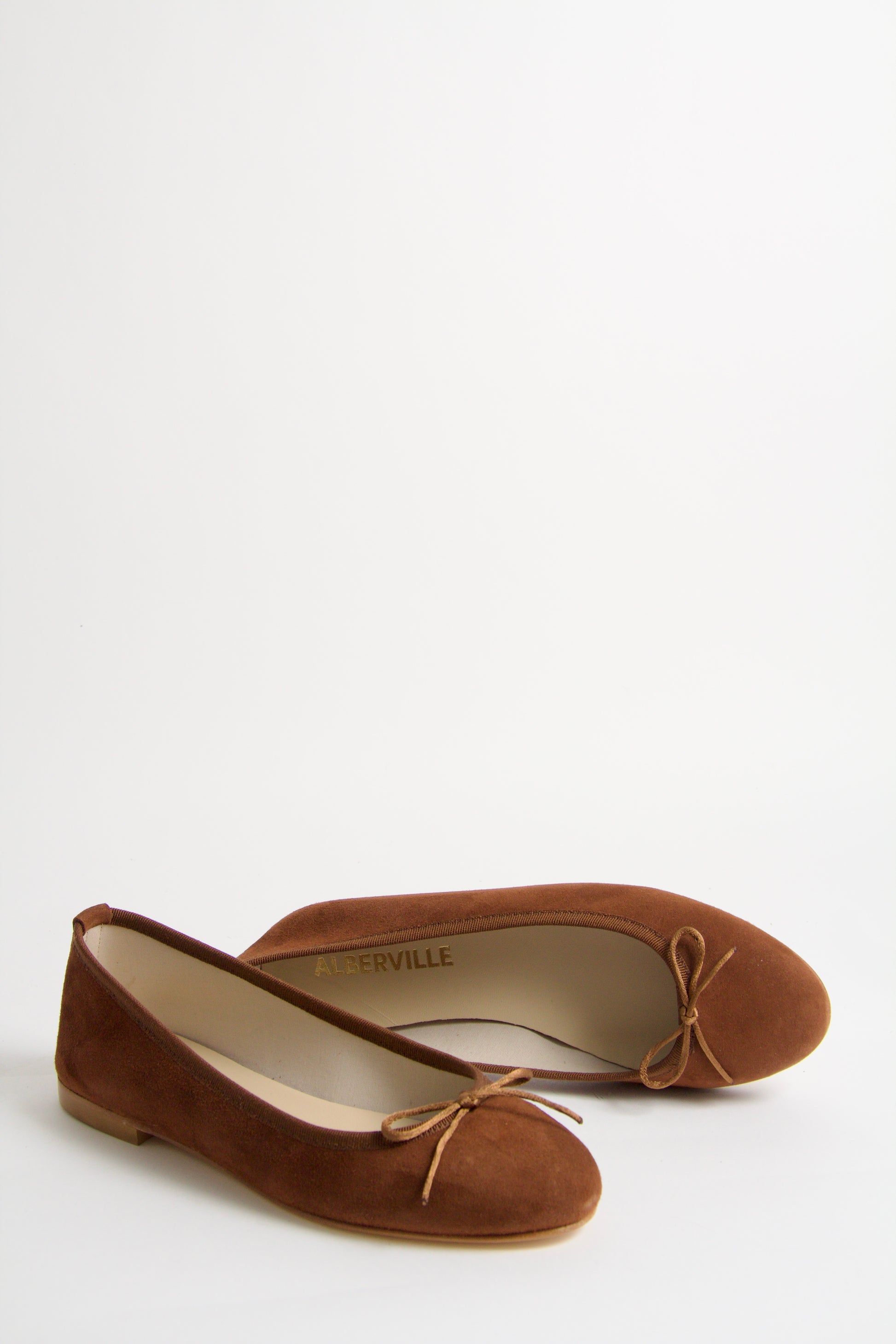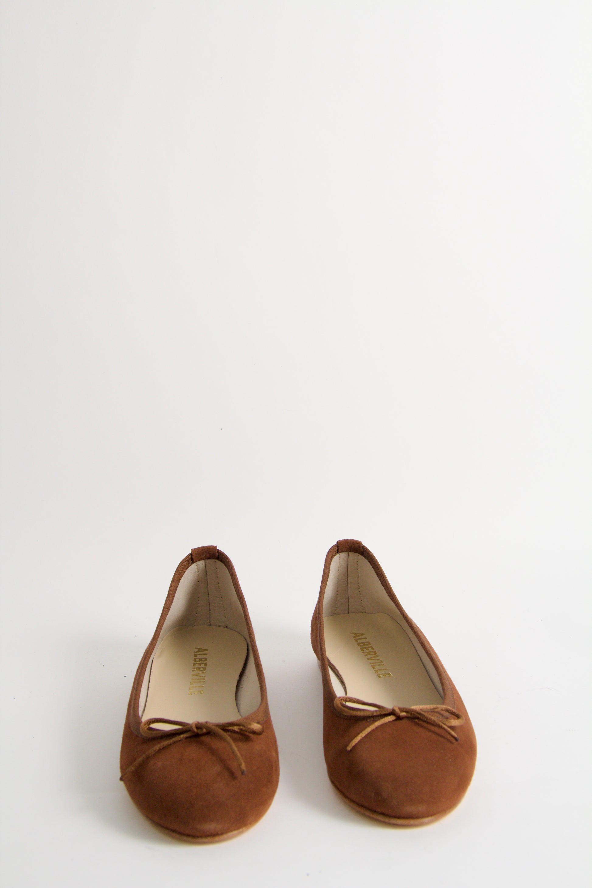 Vanessa är en klassisk ballerinasko i brun mocka med rundad tå och en dekorativ rosett framtill. Modellen har en låg klack.